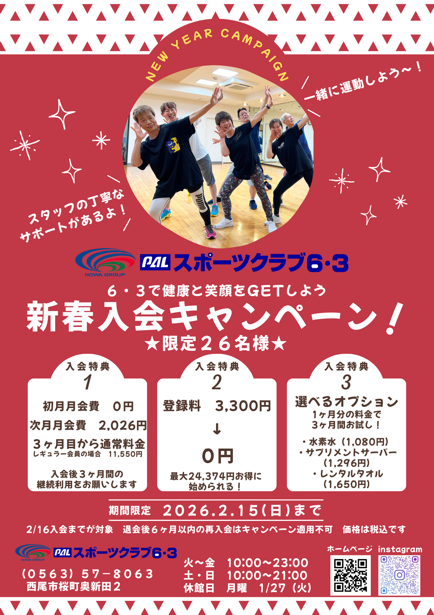 今年の目標は何ですか? 「健康維持」「シェイプアップ」「筋力アップ」 「運動不足解消」「時間の有効活用」 どれもスポーツクラブ6・3で達成できます! 私たちと一緒に運動を始めましょう! 今なら新春入会キャンペーンでお得に☆ 初めての方もスタッフの指導やサポートで安心して始められ、続けられます! 2月15日までの期間限定です!